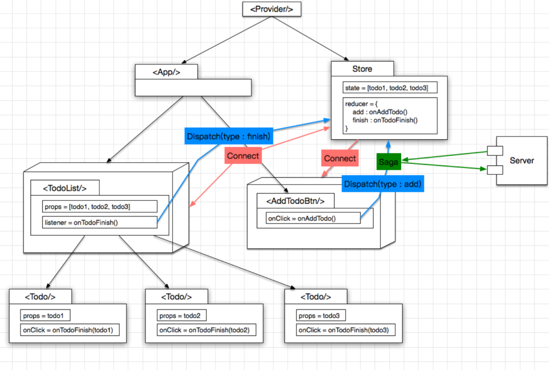 - saga 拦截这个 action, 发起 http 请求, 如果请求成功, 则继续向 reducer 发一个 type addTodoSucc 的 action, 提示创建成功, 反之则发送 type addTodoFail 的 action 即可